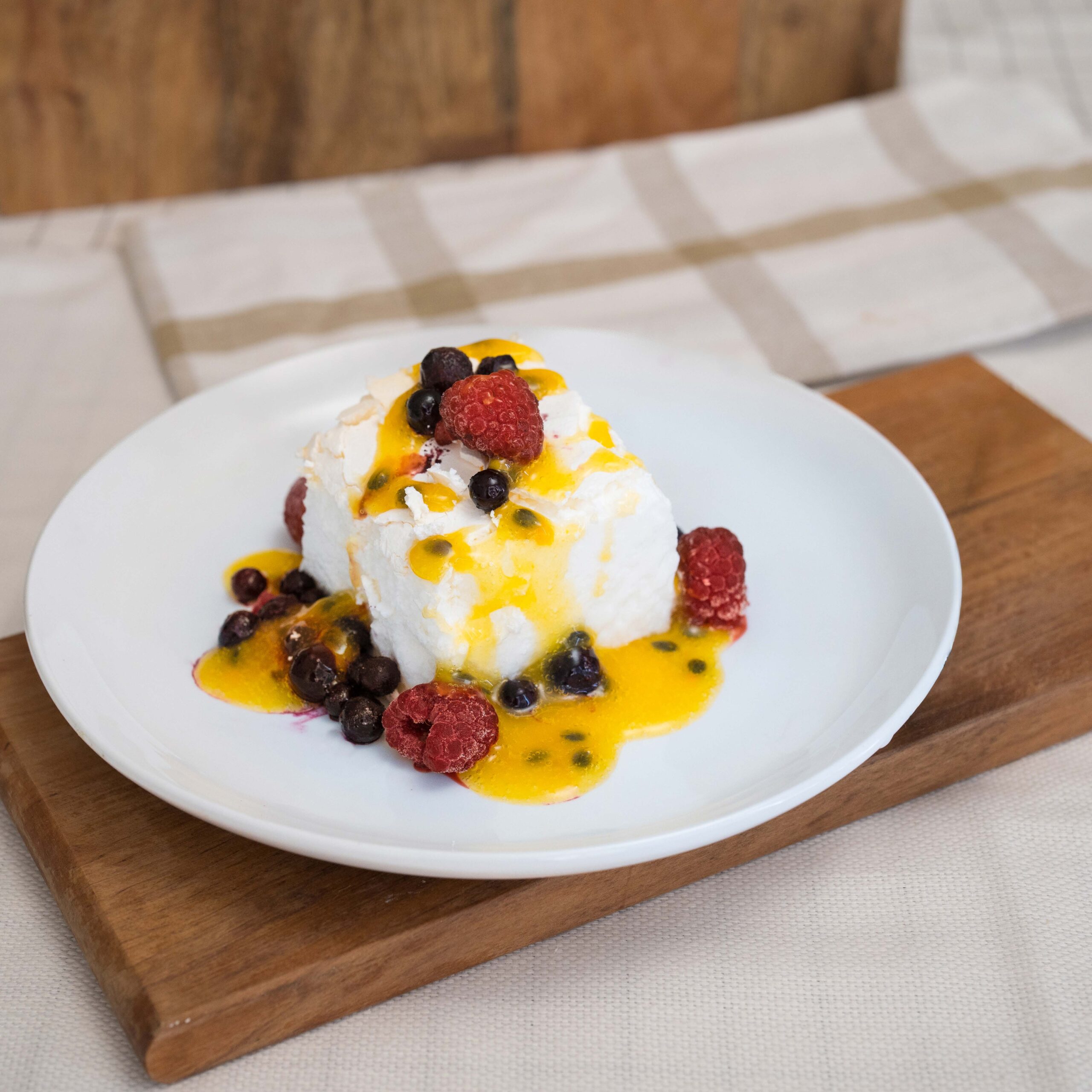 A beloved Australian treat featuring light, crispy meringue with a soft, marshmallow-like centre, topped with fresh berries and passionfruit sauce – perfect for a refreshing summer dessert.